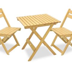 Набор из 3 предметов, комфортно разместит двоих человек. Включает в себя стол и два стула. Его можно использовать в качестве приставного сервировочного стола к большому обеденному садовому столу. Стулья складываются в плоскость толщиной 5 cм лёгким движением руки без использования инструментов. Небольшой наклон сиденья стула позволяет комфортно сидеть даже без упора ногами о пол. Набор можно легко взять с собой на пикник в багажник автомобиля.